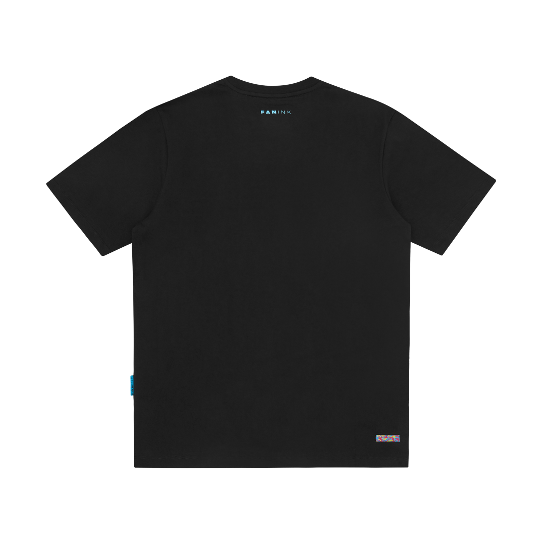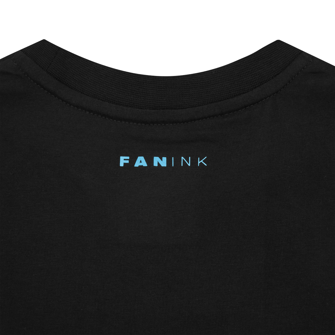 Neon blue and pink angel screen print at front. Fan Ink screen print at top back. Fan Ink woven label at side. Fan Ink digital camo label at back hem. Made in Portugal.